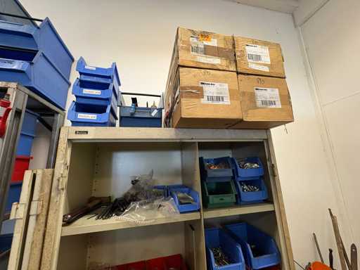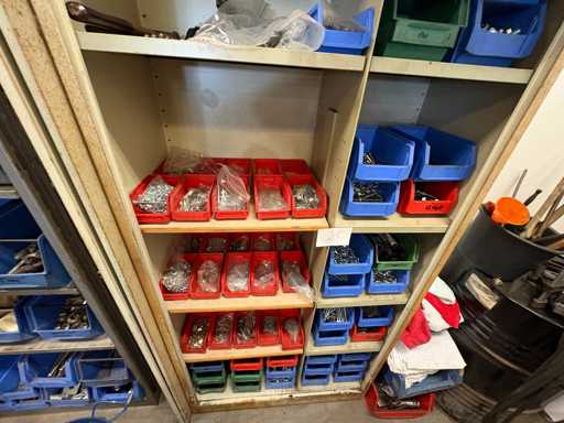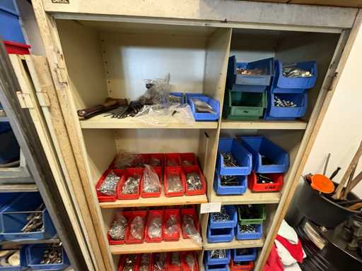 Bestückt mit Kunststoff-Sichtlagerkästen (rot, blau, grün)