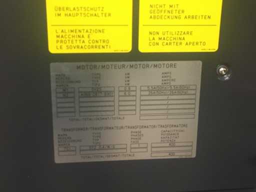 Sicherheits-/Konformität: CE, TÜV-Hinweis, Überlastschutz am Hauptschalter, Warn-/Sicherheitsschilder vorhanden