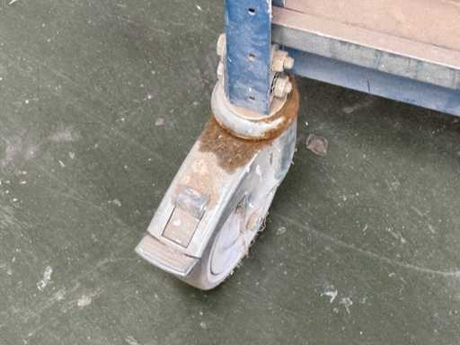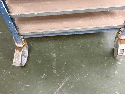 The frame is made of a robust, blue lacquered steel profile, the shelves are made of wood or MDF. The trolleys are mounted on 4 swivel castors. Dimensions approx. 165x60x103 cm (HxDxW)