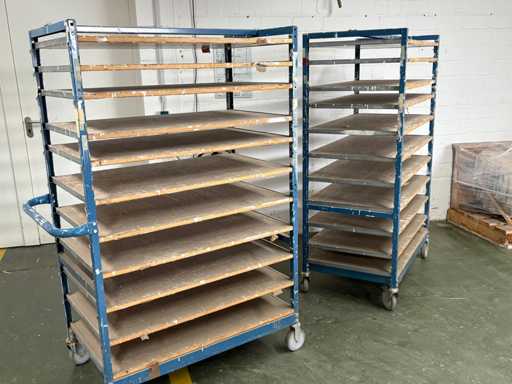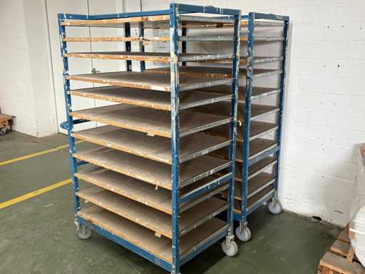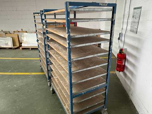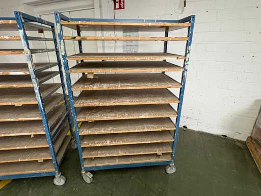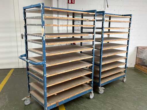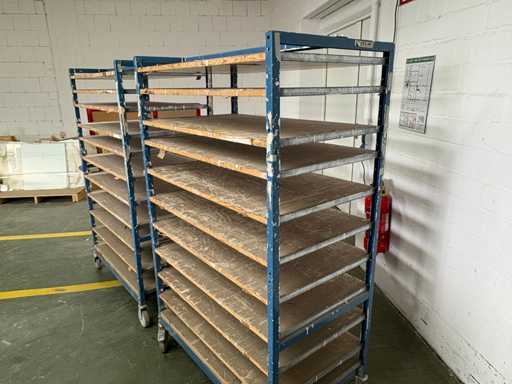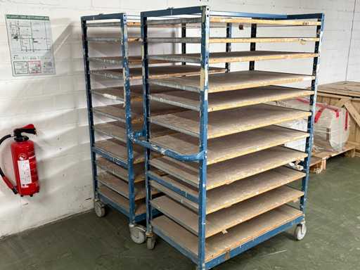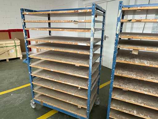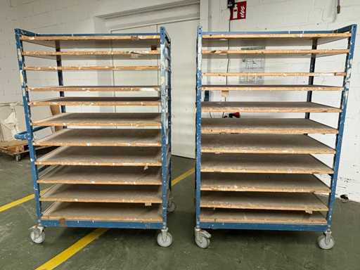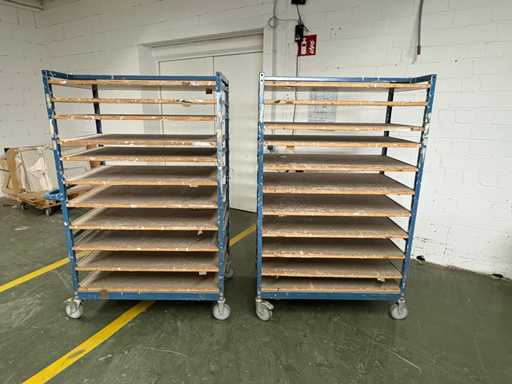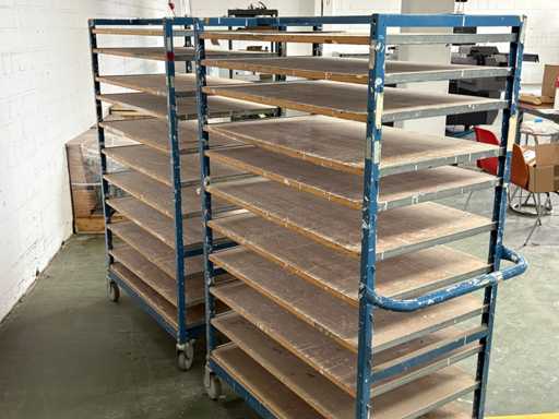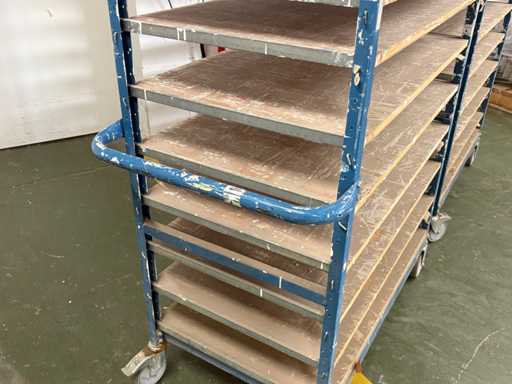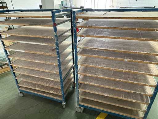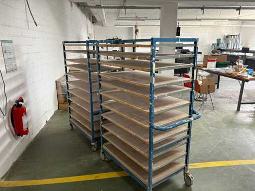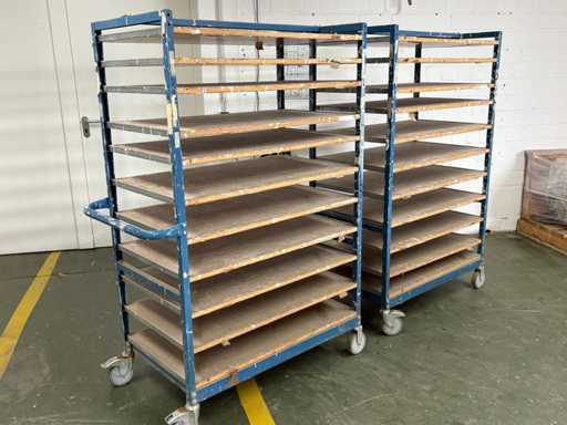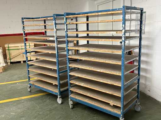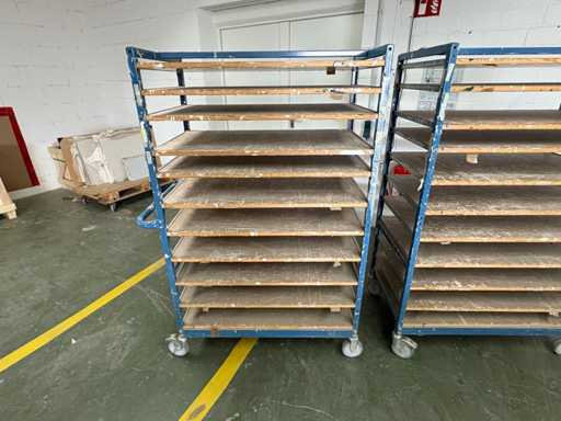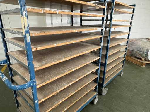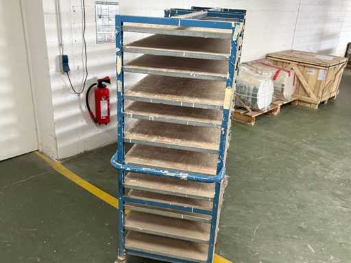 For sale are several used shelf trolleys with fixed shelves, suitable for production, storage, drying or transport of large-scale workpieces, sheet metal, plastic sheets, textile sheets or similar flat materials.