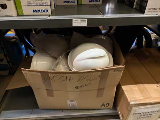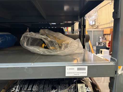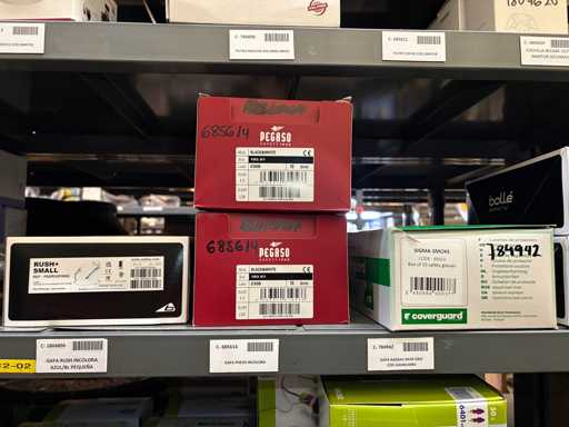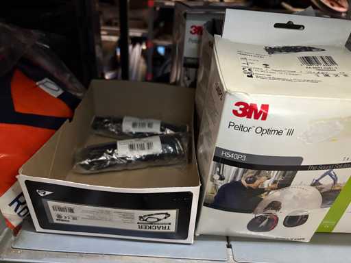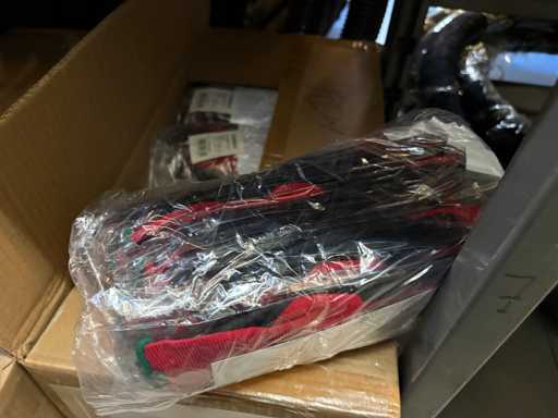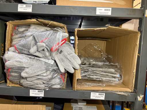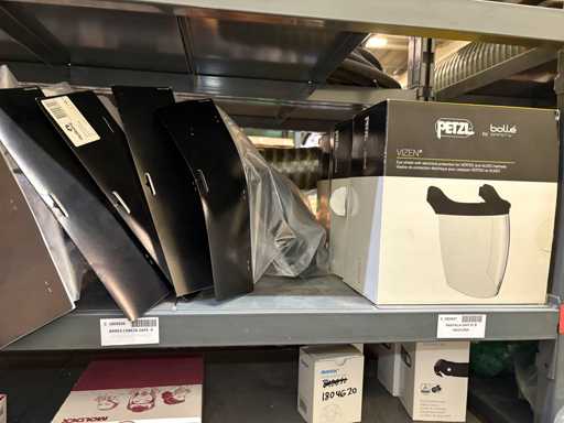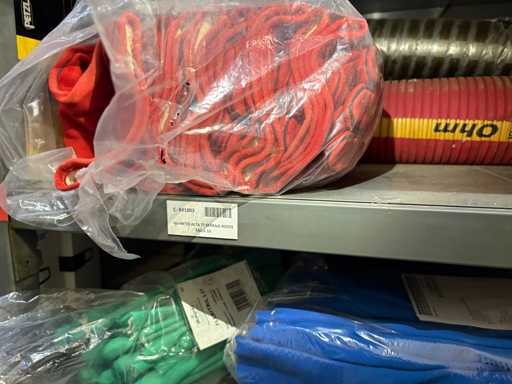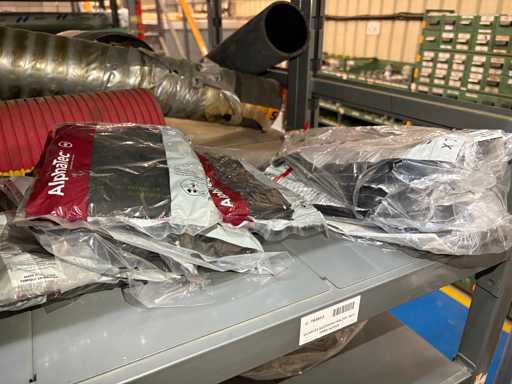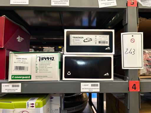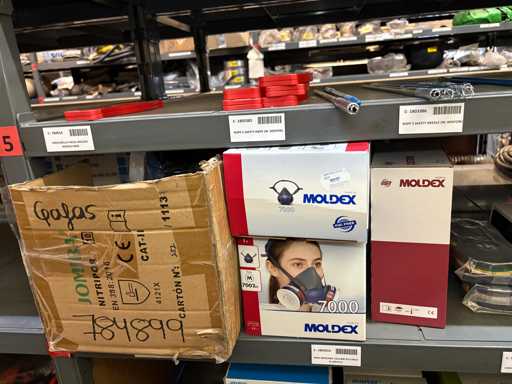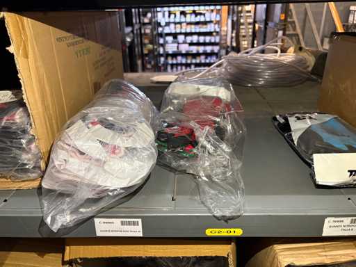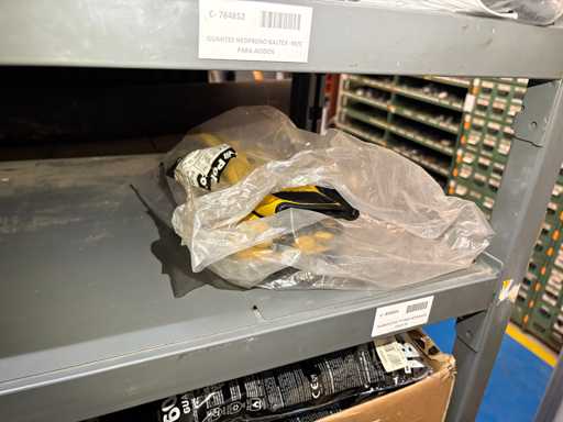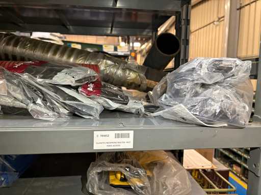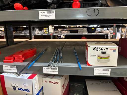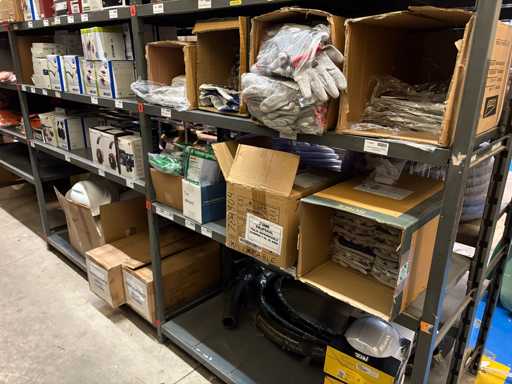 - Shelving not included: Only the spare parts and materials visible on the shelf marked in red in the first photograph are delivered. The metal structure is not part of the lot.