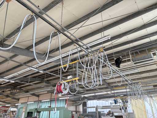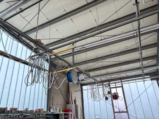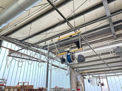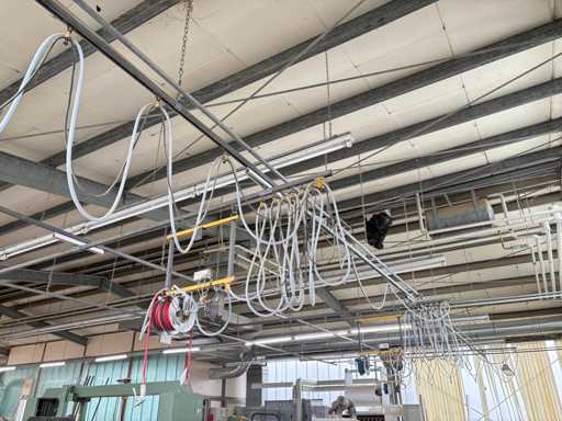 Power distribution with 3 rails with compressed air hose winder and sockets, length each approx. 6000 mm, rigid rail system length approx. 14000 mm (The article is in condition as existing and untested. The article is sold from the foundation and without content / material!)