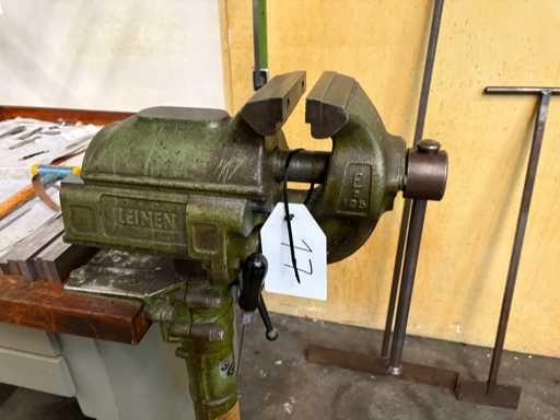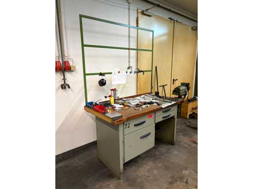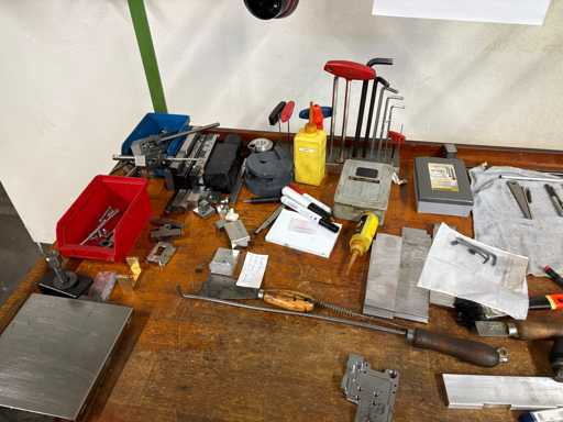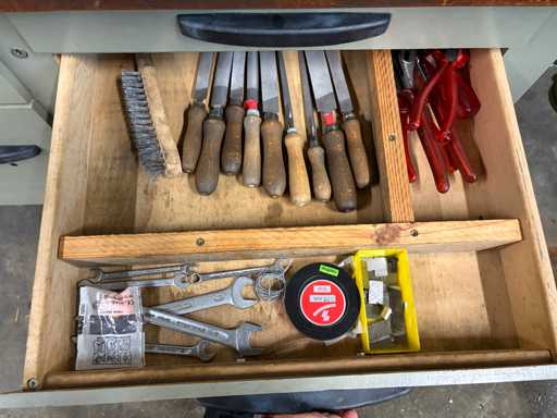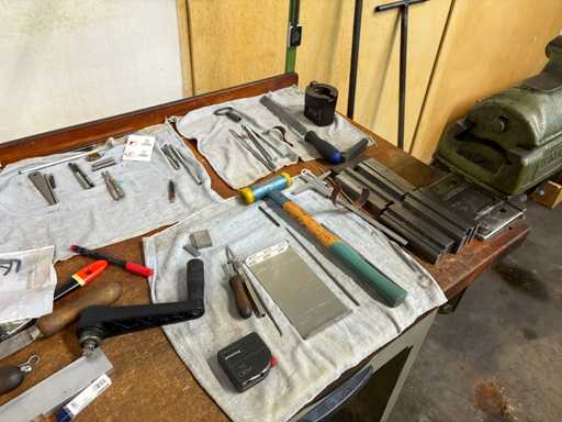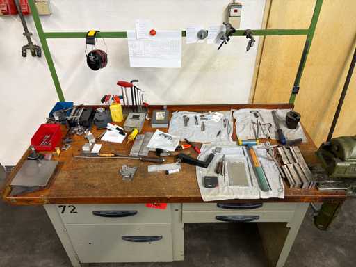 Content consisting of: an attached vice (jaw width: 125 mm) and various tools such as files, pliers and open-end wrenches.