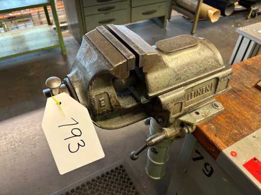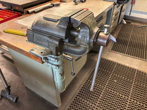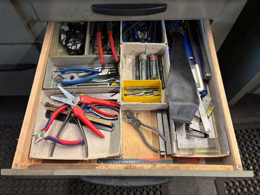 Contents consisting of: various open-end wrenches, screwdrivers, pliers, other various hand tools, an attached vice (jaw width: 125 mm) and a Bosch hand-held tool.