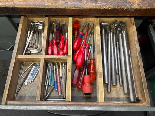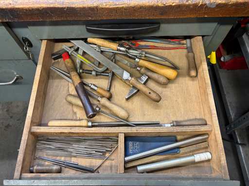 Content consisting of: various hand tools, with mounted vice (manufacturer: LEINEN, jaw width approx. 125 mm).
