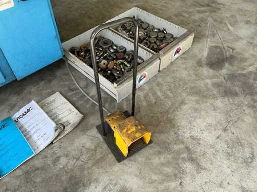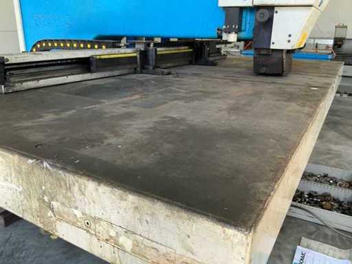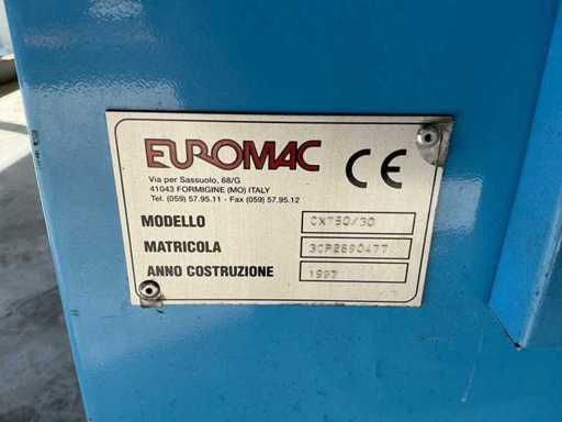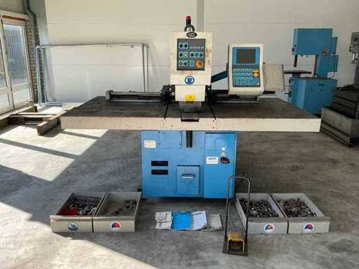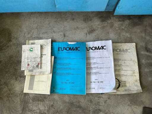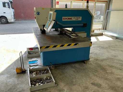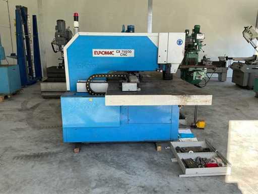 Equipped with: Euromac CX 750/30, CNC-controlled hydraulic punching machine v, 30 ton punching force, stroke control adjustable, suitable for standard Euromac tools, maximum plate capacity steel: approx. 6 mm, stainless steel: approx. 4–5 mm, aluminum: approx. 8 mm, working range X-axis range: approx. 1,250 mm, Y-axis range: approx. 2,500 mm, maximum plate size: approx. 1,250 x 2,500 mm, repositioning function, CNC control with programming unit, manual control + automatic cycle, emergency stop available, power supply: 400V – 3~ – 50 Hz, hydraulic system integrated, machine dimensions (approx.) length: approx. 3,200 – 3,500 mm, width: approx. 2,500 – 3,000 mm, height: approx. 2,000 – 2,200 mm, weight: approx. 4,000 – 5,000 kg, complete with various tools, working disassembled, current operation unknown.