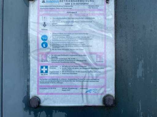 Verladebedingungen: siehe Artikelspezifikationen ACHTUNG: ZUM BETRETEN DES GELÄNDES SIND SICHERHEITSSCHUHE NOTWENDIG. ANMELDUNG BEI DER ZENTRALE VON FIRMA MAGMA Geschäftskäufer aus der Europäischen Union (EU) und Nicht-EU-Ländern (Drittländer) sind verpflichtet, auf ihren Gesamtkauf eine Kaution an Troostwijk Deutschland zu zahlen. Diese Kaution wird auf Grundlage des in der Bundesrepublik Deutschland geltenden Mehrwertsteuersatzes berechnet. Nach Bestätigung, dass die erworbene Position die EU verlassen hat, wird die Kaution an den Käufer zurückerstattet: • EU-Käufer müssen Troostwijk Deutschland eine sog. Gelangsbestätigung [laden Sie dafür die hier beigefügte Vorlage „Template_Intra-Community Supply (DE-EN)” herunter] ausgefüllt an export.de@troostwijkauctions.com zurückschicken, um die Kaution zurückerstattet zu bekommen. • Nicht-EU-Käufer müssen eine Kopie der elektronischen Ausfuhrmeldung (EX-A mit MRN - nur zur Prüfung) oder bei niedrigerem Warenwert einer abgeschlossenen Ausfuhrerklärung mit einem Stempel von der EU-Grenzzollstelle an export.de@troostwijkauctions.com zurückschicken, um die Kaution zurückerstattet zu bekommen.