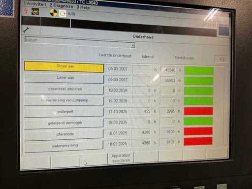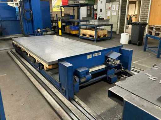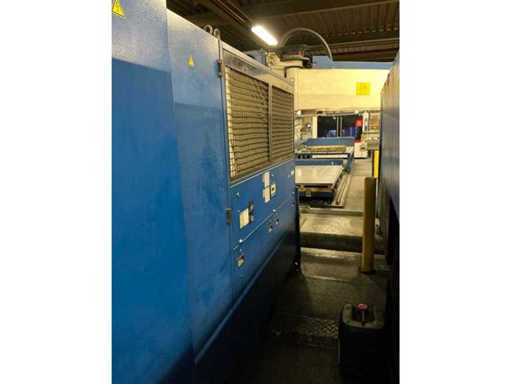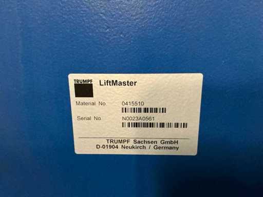 Laser module Truflow 4000; connected load 88 kVA; maximum thickness steel 20 mm, maximum thickness stainless steel 15 mm, maximum thickness aluminum 20 mm, positioning 0.1 mm; Riedel cooling unit; Trumpf Liftmaster plate handler; equipped with 2x electrically driven plate trolley capacity 5000 kg; for supply and removal; hours increasing.