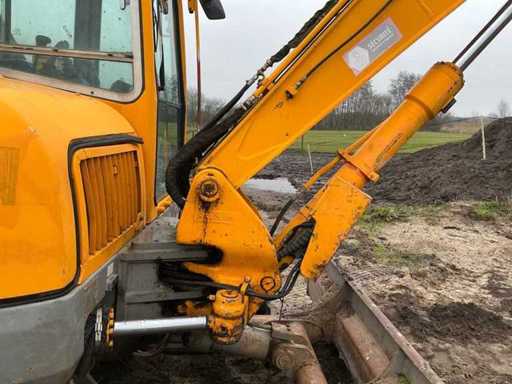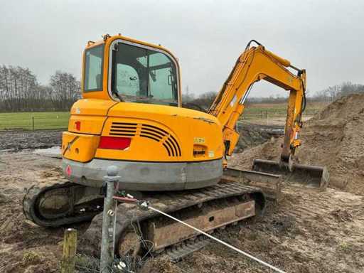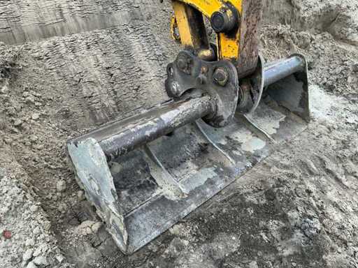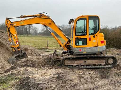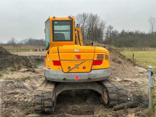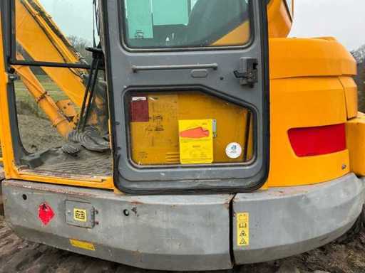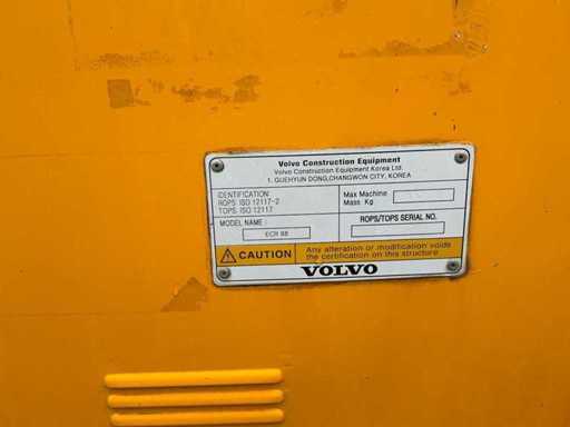 Equipped with: quick-change clack, Volvo ECR88 (±8.5 tons, year of construction 2013) is a crawler excavator with a Volvo 4-cylinder diesel engine of approx. 41–42 kW (±56–57 hp), operating weight ±8,600–8,800 kg, standard boom length approx. 4.2 m, digging depth approx. 4.3 m (up to ±4.6 m with long handle), maximum reach ±7.2 m, bucket capacity ±0.25–0.35 m³, standard track width 450 mm, Transport dimensions approx. 6.3 × 2.3 × 2.55 m (L×W×h) and a compact short-radius superstructure.
