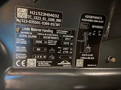 2017 Linde E25HL 2.500kg 3.+4. Fork Adjuster Electric Forklift 9.395 hours