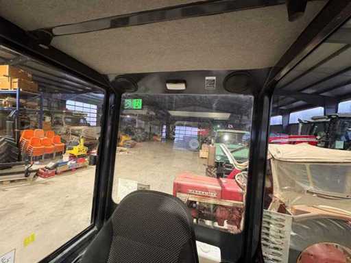 The cab is fully equipped, including controls, gauges, and safety stickers.