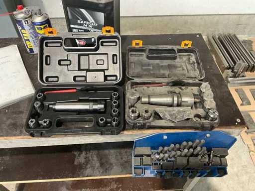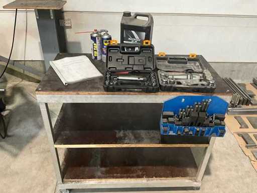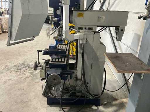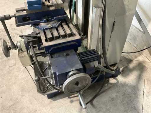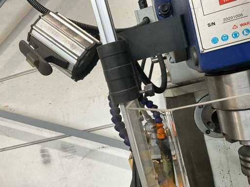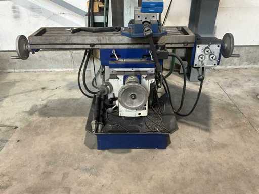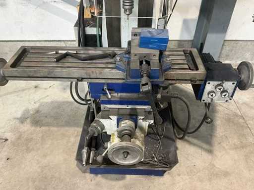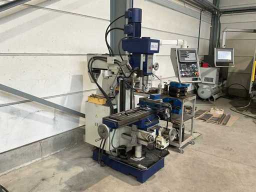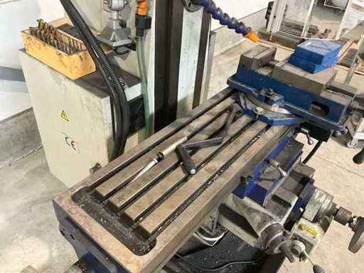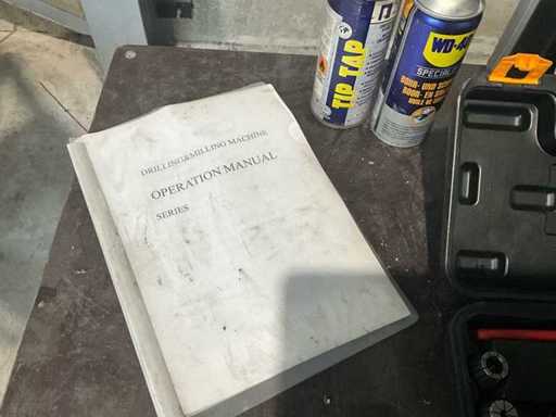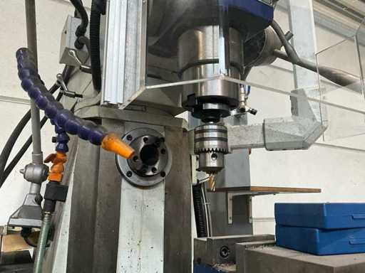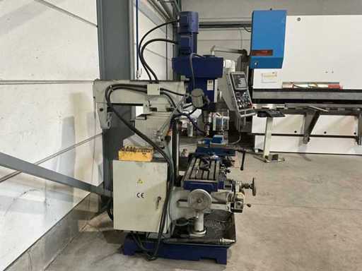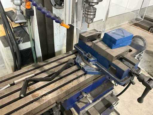 Complete working milling/drilling machine with digital readout and variable speed. Equipped with cooling installation, machine clamp and tools. Machine is functional and very little used, purchased March 2022 (invoice available) - including rolling work table with material in the photo - Drilling capacity steel 50 mm, Milling capacity steel 25 mm, Mantle milling capacity 100 mm, Horizontal motor 1.5 KW, Vertical motor 2.2 KW, Speed range horizontal milling spindle 60 ~ 1350 rpm, Speed range vertical milling spindle: variable 100 ~ 2000 rpm, Spindle holder ISO 40, Table 1000 x 240 mm- INCLUDING: