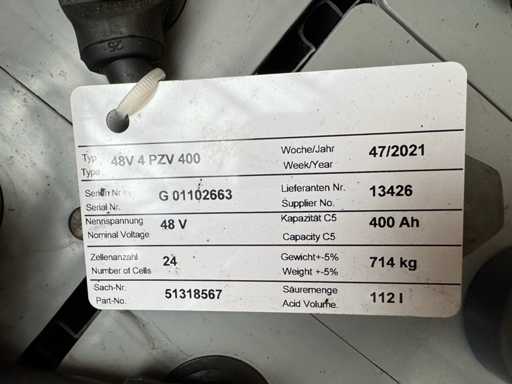 Battery 47/2021 48V 400Ah, with very good performance, measured at 50.6V.