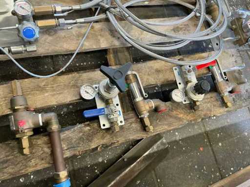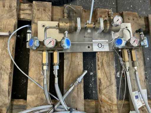 Very solid industrial gas distribution set, from a professional storage room for oxygen cylinders. Everything has been removed in working order and is in good condition. Ideal for use in laboratories, gas technology, CO₂/Argon/O₂ distribution or as part of a larger plant.