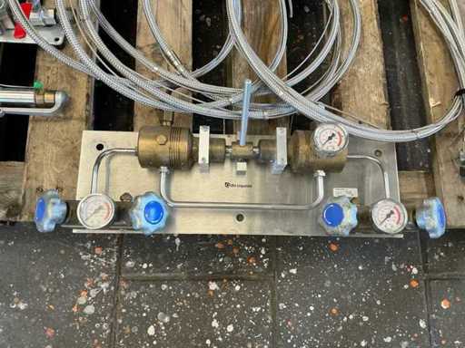 Industrial gas distribution unit from the top brand Air Liquide, working removed from a professional installation. Fully equipped with valves, pressure gauges, overpressure protection and mounting plate. Ideal for technical installations, laboratories or gas technology (CO₂, O₂, N₂, Argon, etc.).
