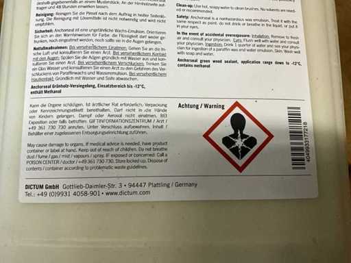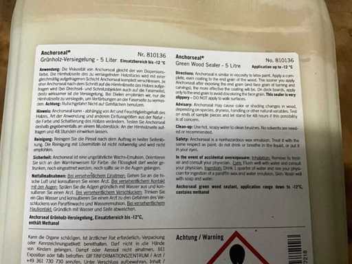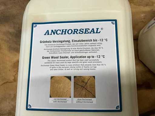 2 canisters each of 5l Anchorseal end wood sealant – crack protection for sawn timber and blanks Prevents rapid drying out and thus reduces cracks and fungal infestation of valuable wood or sculptures. Simply apply thinly with the brush. The wax emulsion combines with the moisture in the wood and forms a thin transparent wax layer after drying (within 2-10 hours, depending on the weather). Tip: For very fine sculptures or if the wood is already very dry, the wax can be diluted with a little water.