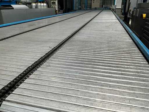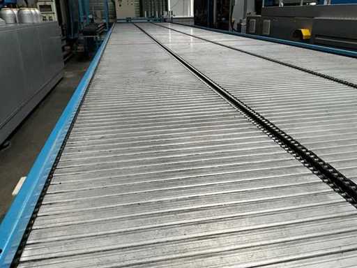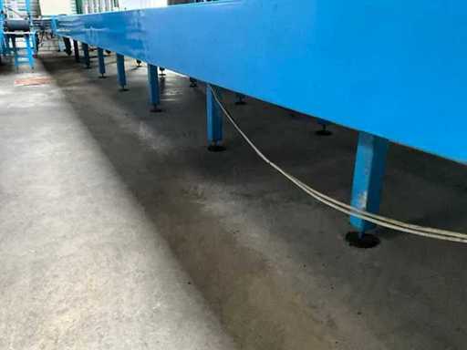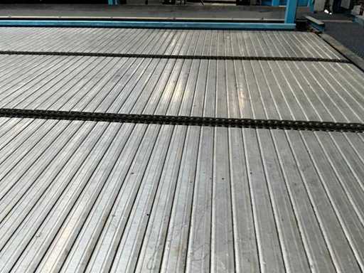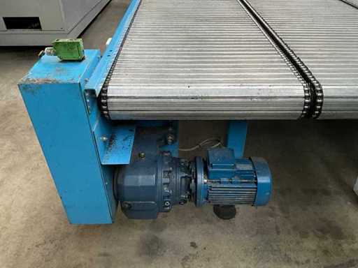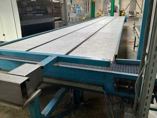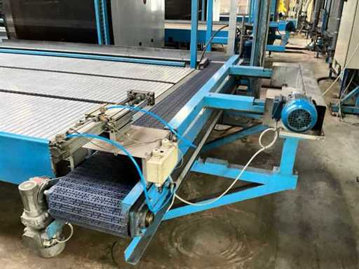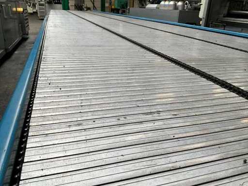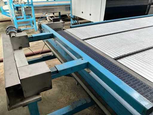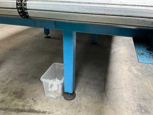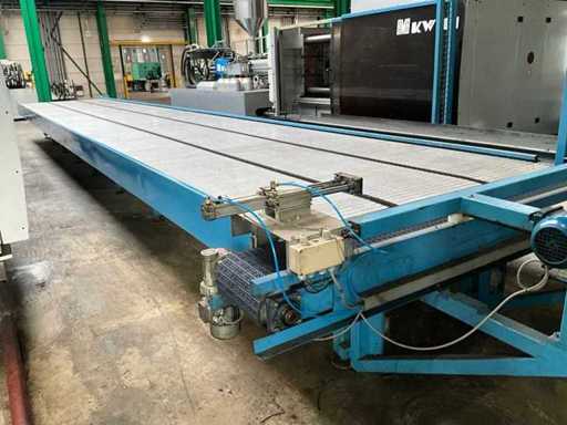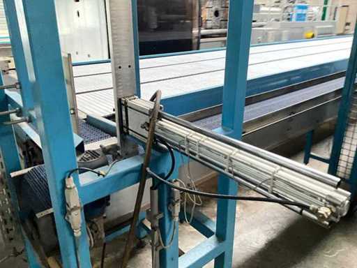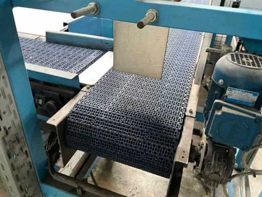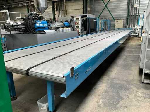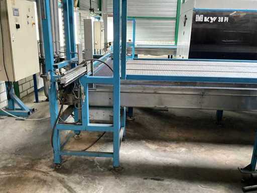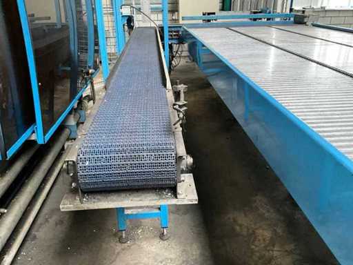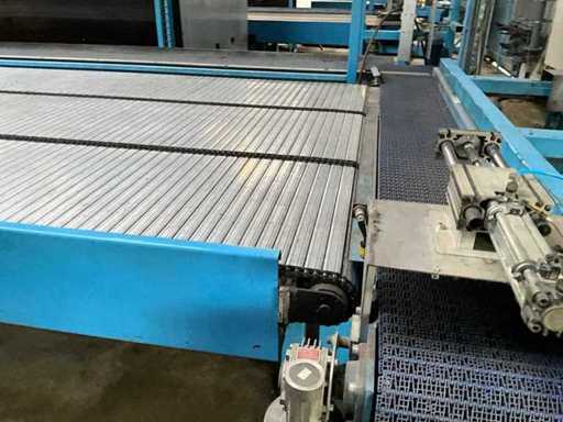 equipped with electrically driven supply link belt (4900x300 mm), pneumatic product pusher, various product detection sensors, belt height 870 mm, Please note! Pick up by appointment