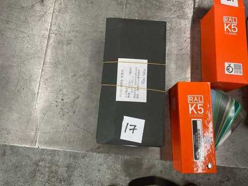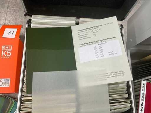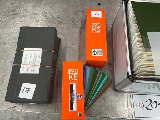 Scope: Several colour fans (including RAL K5 Classic), various colour sample cards, sample plates, sample cases (aluminium), plastic storage boxes.