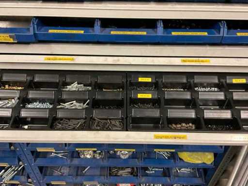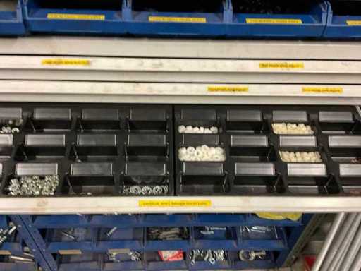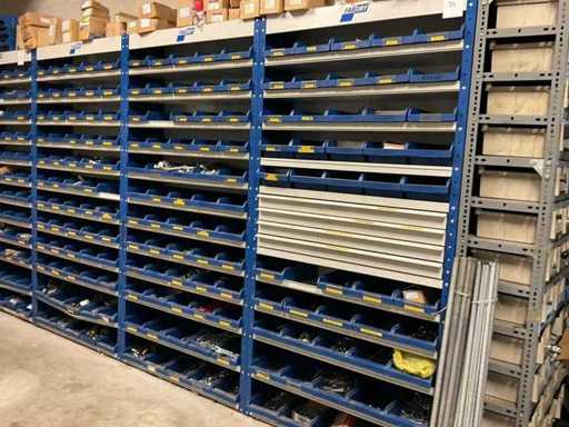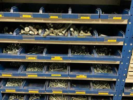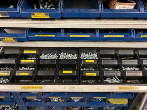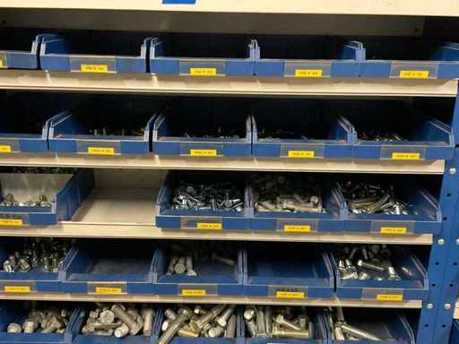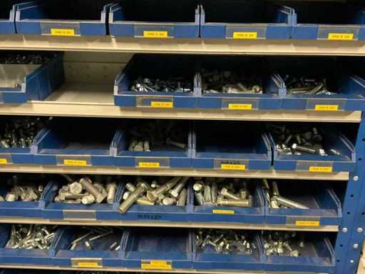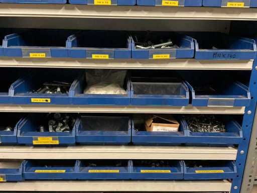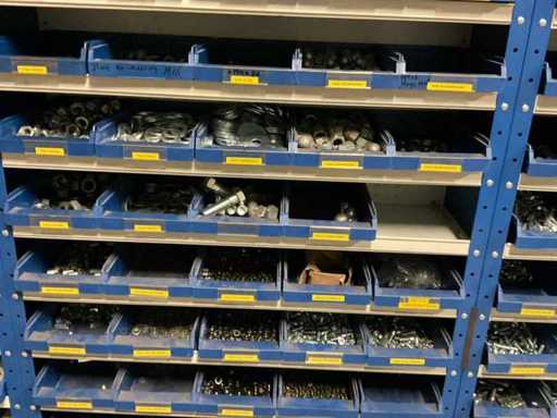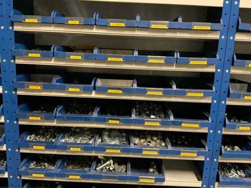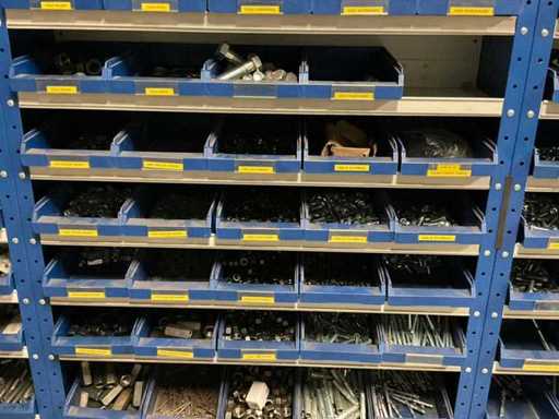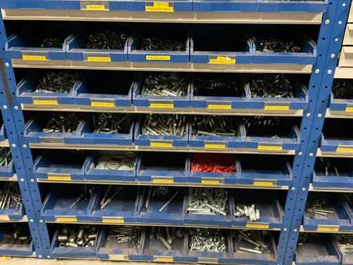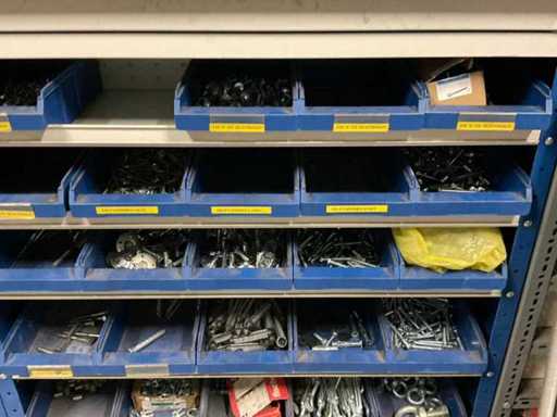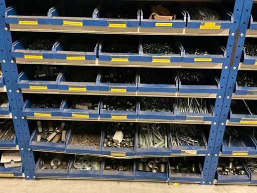 including bolts; nuts; rings; buses; self-tappers etc.; incl. storage bins and 3-section shelving