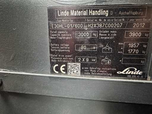 Battery 2016 S+UVV 08/26 Linde E30 Triplex 530cm 3+4.Valve Electric Forklift