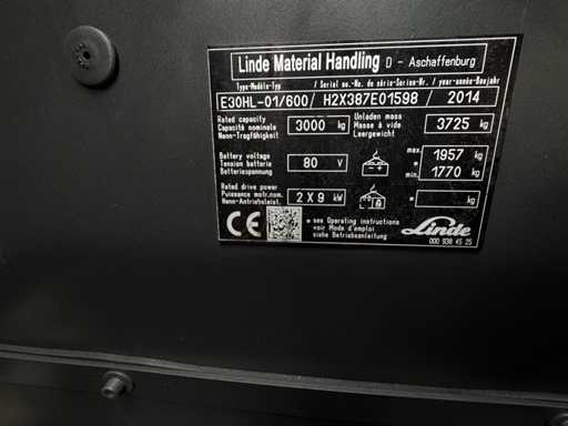 Battery 2022 Service + UVV 07/2026 Linde E30HL Triplex 3rd + 4th Fork Adjuster Electric Forklift 9,187 hours