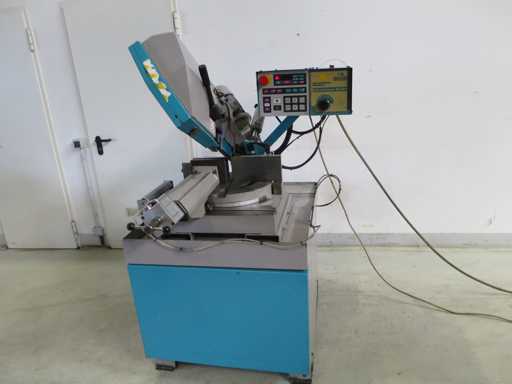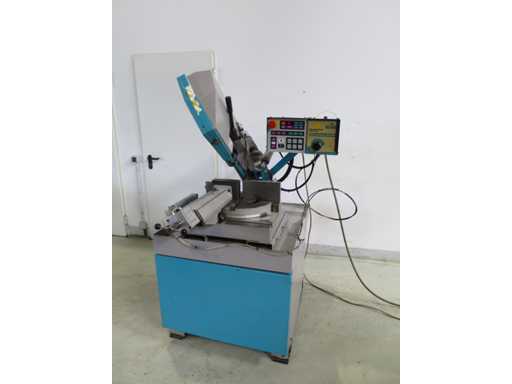Semi-automatic miter band saw - Double mitre - Micro spraying device Cutting diameter 230 mm Saw blade length 2770 mm Table height 940 mm Cutting range at 90 degrees: around 230 mm Cutting area at 90 degrees: flat 280 x 150 mm Cutting area at 90 degrees: square 230 x 230 mm Cutting range at 45 degrees: round R 180 mm Cutting range at 45 degrees: round L 200 mm Cutting range at 45 degrees: square R 155 mm Clamping vise: 280 mm Cutting speed 40 / 80 m/min Total power requirement 1.5 / 1.8 kW Machine weight approx. 0.4 t Space requirements approx. 0.9 x 1.3 x 1.8 m