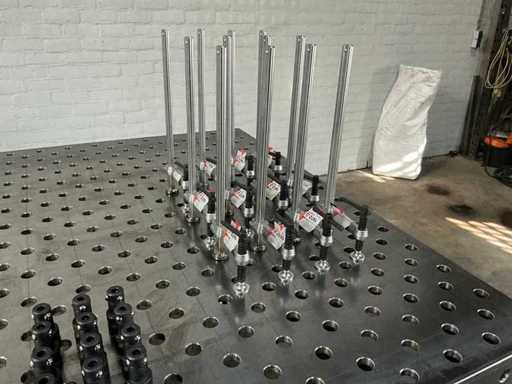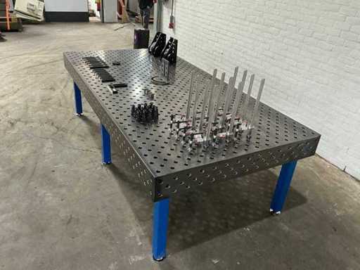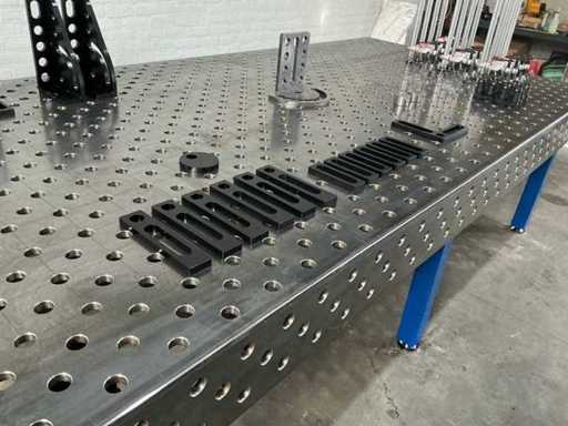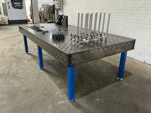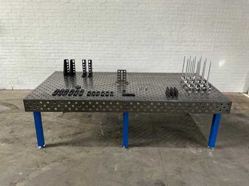 Welding table/clamping table, drilled holes and diagonal grid. Table-thickness: 15mm, hole-diameter: 28mm. Including a full set of accessories: