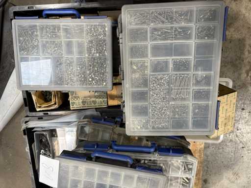 approx. 8–10 assortment boxes with stainless steel screws, nuts, washers, retaining rings, crimping eyes, etc.