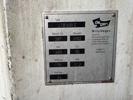 For sale is a used Degen UTB 600 E, built in 2002, made in Germany (Willy Degen, Schömberg). The machine is equipped with a Siemens Simatic OP17 control system and is suitable for semi-automatic machining of small to medium-sized workpieces – especially for drilling, countersinking and light milling work.