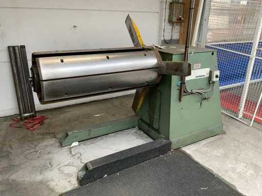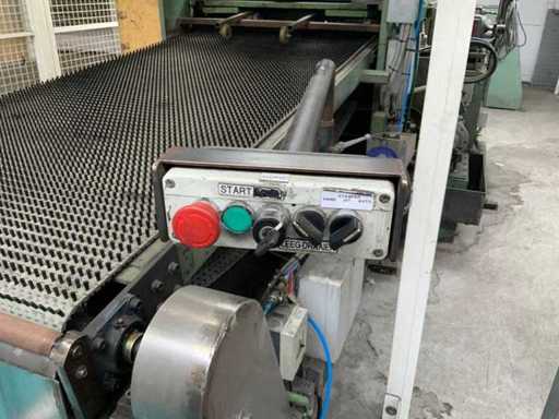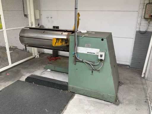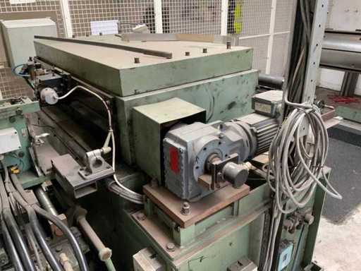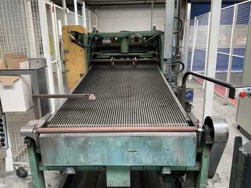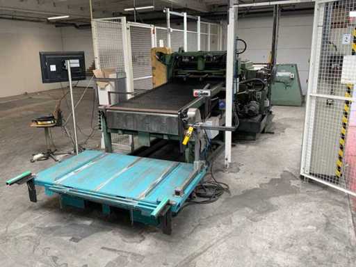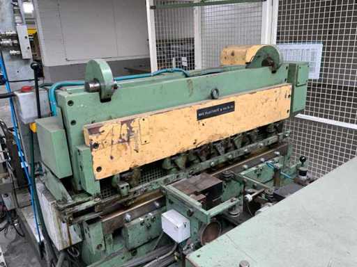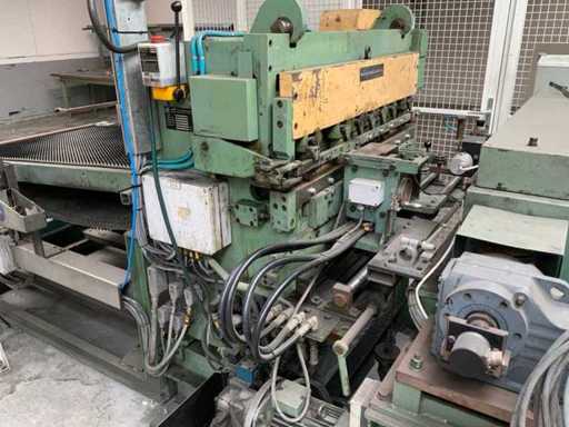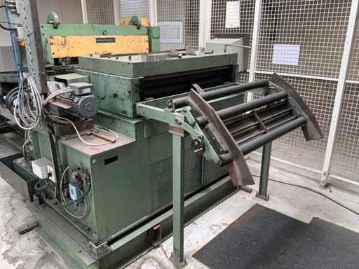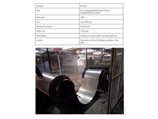Consisting of: 1 BESANCON unwinding reel, max. coil weight: 3000 kg, 1 BESANCON straightening machine, working width: 1050mm, 1 DMF hydraulic shearing machine, type: 4G 110, no. 351 (1983), maximum plate thickness: 2 mm, own weight: 1200 kg, motor power: 2.2 KW, 1 brush discharge belt, size: L2400 x W1000 mm, 1 stacker, including 1 touchscreen operator panel, control box and personal fencing security
