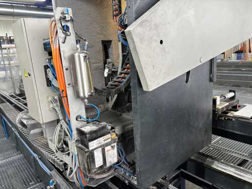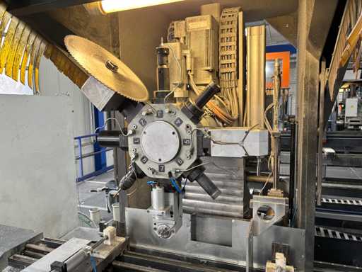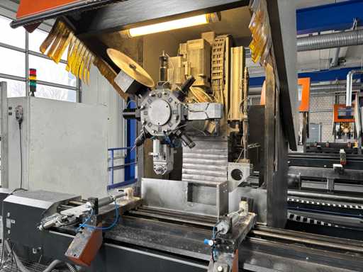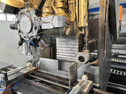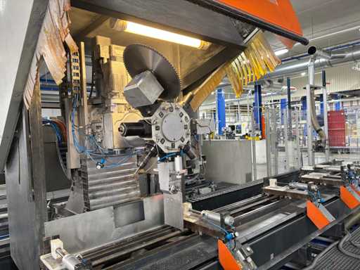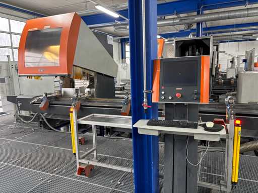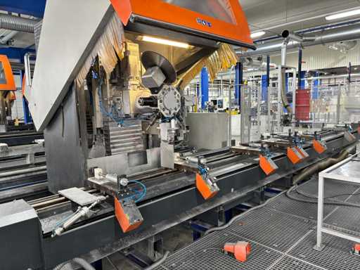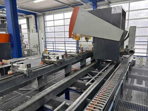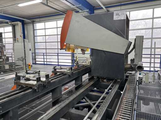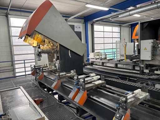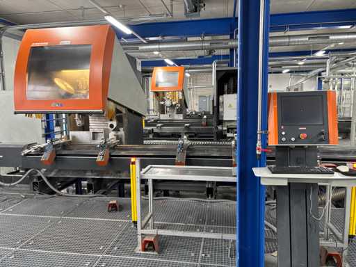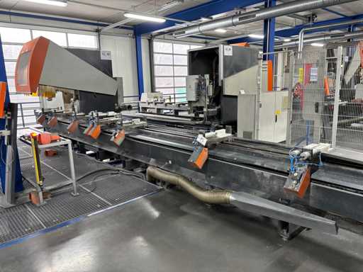 CNC Bar Machining Center for Aluminum, Machine No. 1310031119, machining length max. approx. 7200 mm, tool turret 8-fold, spindle power max. approx. 5.5 KW, angle head sawing unit, angle head drilling/milling horizontal 2 pieces, drilling/milling vertical 5 pieces, brackets 8 pieces, material tensioner 8 pieces, control Ferrocontrol (The article is in condition as existing and unchecked. The article is sold from the foundation and without content/material! For the dismantling and loading of the item, there are no pallets, other packaging material available on site and the buyer must rent a forklift, tank rollers, machine jacks, etc. at his own expense if necessary! Attention: The Elumatec CNC bar machining center stands on a pedestal with a mesh floor. This area was the former ramp area. The mesh floor must not be driven on with a forklift. Important, bring drivable plates and tank rollers for dismantling! If you have any further questions, contact Ludger Reuther, mail: lre@surplex.com or mobile: +49 173 6172604)