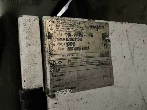 Equipped with "EWM" Taurus Synergic S Drive 4 wire feeder, duty cycle 550A 60% and 420A 100%; Case with various welding accessories