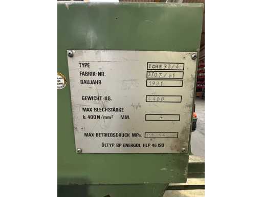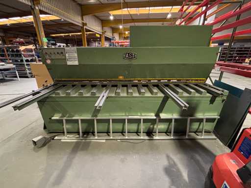 For sale is a robust hydraulic guillotine shears from the German quality manufacturer FASTI, model TCHE 30/4, suitable for precise cutting of sheet metal up to 4 mm thick. The machine is fully functional and currently ready for use.