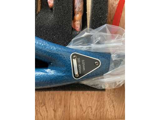 Each micrometer features two easily interchangeable anvils. This model features a 300-400 mm measurement range. Graduation: 0,01 mm