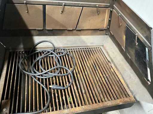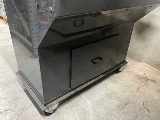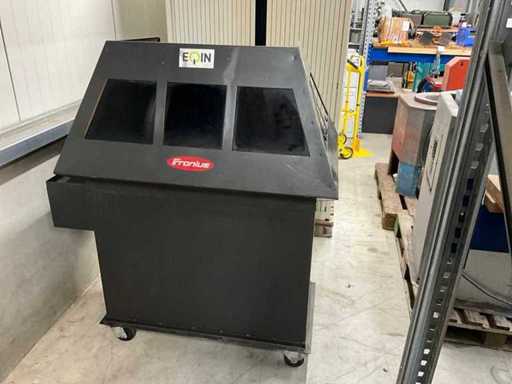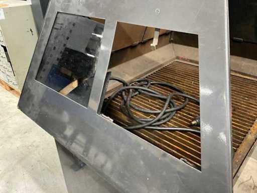 Industrial welding/grinding table with integrated fume extraction from EQIN. Equipped with steel grid worktop, splash guards and mobile base. Suitable for extraction of welding fumes and dust during welding and grinding work.