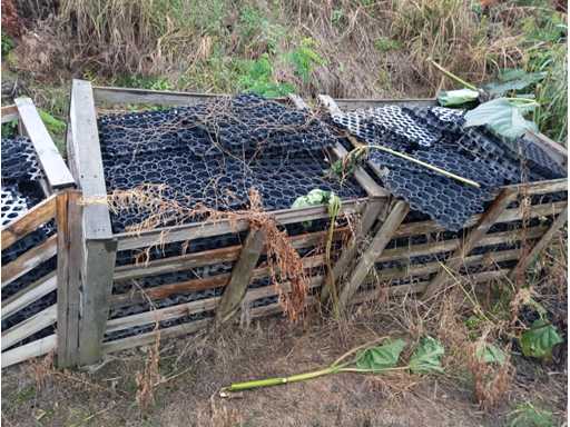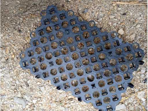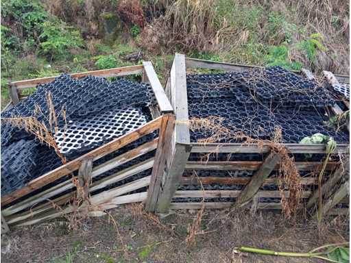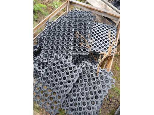 Black plastic (HDPE or similar polymer) lawn grid for surface stabilization, each grid measures 560×380×30 mm. Approx. 600 units included, covering ~128 m². Stored outdoors in wooden crates, not palletized.
