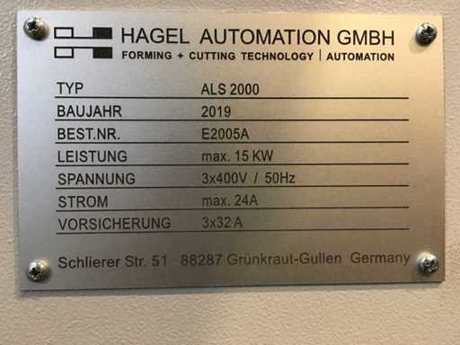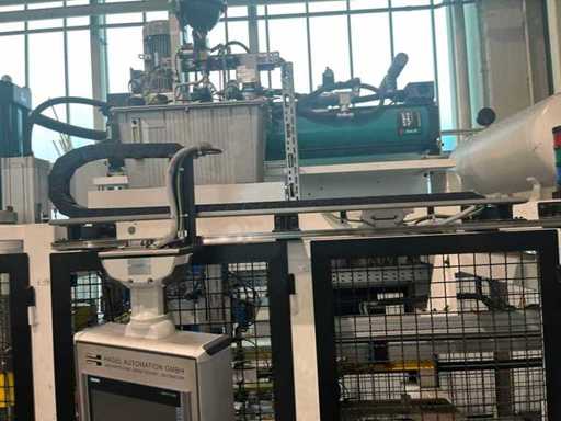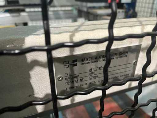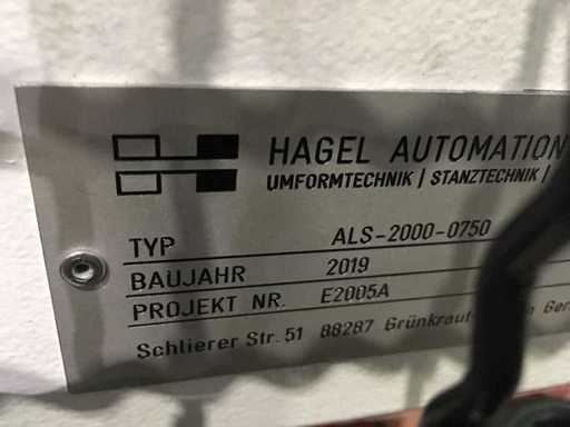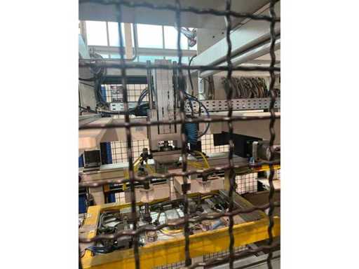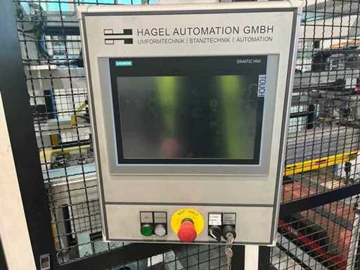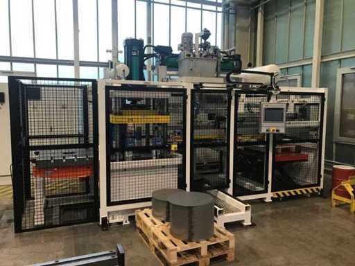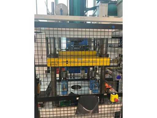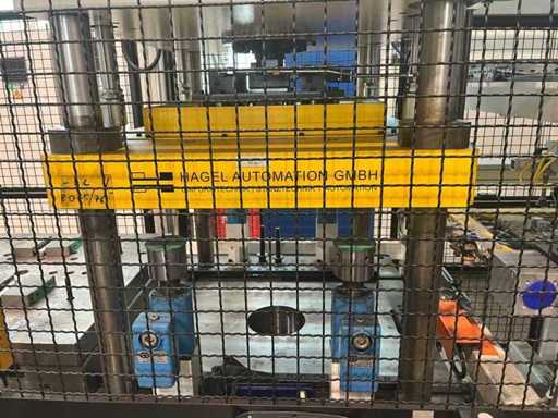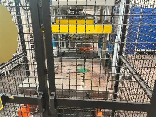 AXLE HOLE PUNCH Structure Three-part frame with column guides Drive punching axle pneumo-hydraulic Press force 490 kN Total press stroke: 100 mm Press stroke: 12 mm Cutting impact damping: hydraulic Max. travel cutting impact absorption 7 mm Required air pressure (factory) 6 bar max. tool size 880 x 880 mm min. tool size TBD Ejector function hydraulic Ejector stroke 10 mm Ejector force approx. 50 kN Tool Weight TBD Weight of the upper part of the mould TBD Diarrhea hole diameter 120 -150 mm Clamping tool adapter plate according to template drawing Infeed height top table top 155 mm Adjustment of infeed height due to tool regrinding 0 to -15 mm Disposal of stamping waste. through the table into a box Diameter of punching waste. .. 25 -50 mm Disposal of scrap metal in DLR in crate Manual tool installation Tool clamping manual Pitch circle diameter ejector quills (min -max.) 250 to 500 mm AUTOMATION Destacking point Lifting unit for circuit boards Fork driven by spindle and servo motor Lifting height 600 mm Lifting weight 1500 kg Insertion of stacks manually on pallet Stacking accuracy +/- 10 mm Separation of the circuit boards Expansion magnets Number of expansion magnets .. 2- 4 pieces Destacking axis Drive Feed Servo-motor Number of servo motors 1 Mechanical Feed Planetary Gearbox with Timing Belt Drive Travel distance feed axle 850 mm Acceleration feed axis 6 m/s² Drive lifting stroke pneumatic cylinder Lifting stroke 50 mm Pick-up of the blanks pneumatically, vacuum suction cups Traverse curve trajectory curve, fifth-order polynomial Tooling interface Master Mount System Centering Station Drive hub from centering station pneumatic Stroke distance approx. 20 -30 mm Number of centering stops 4 Blank feeders on feed axis from below REMAINING TECHNICAL DATA ACCORDING TO DESCRIPTION