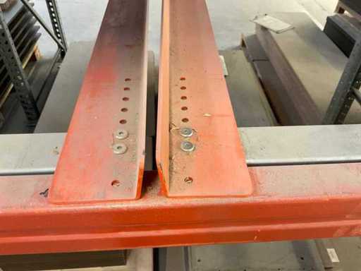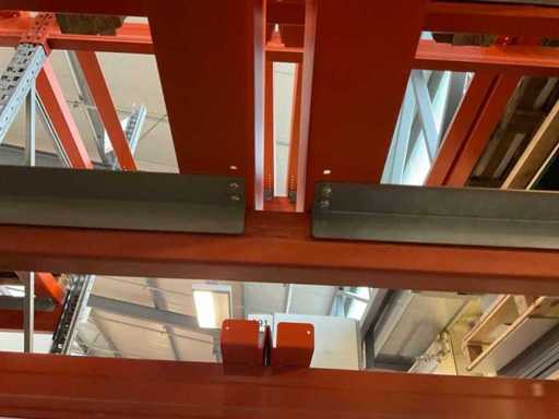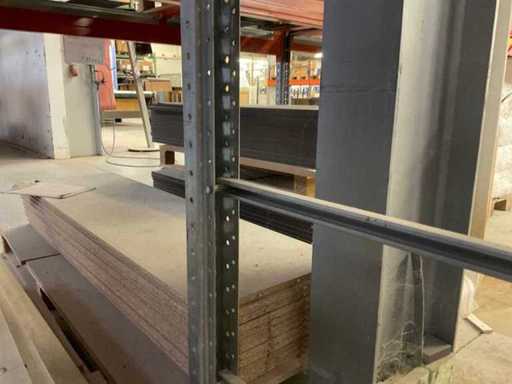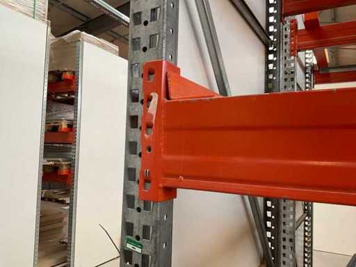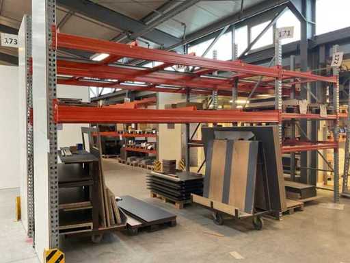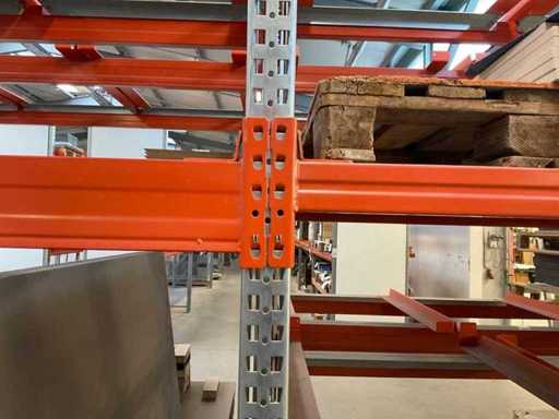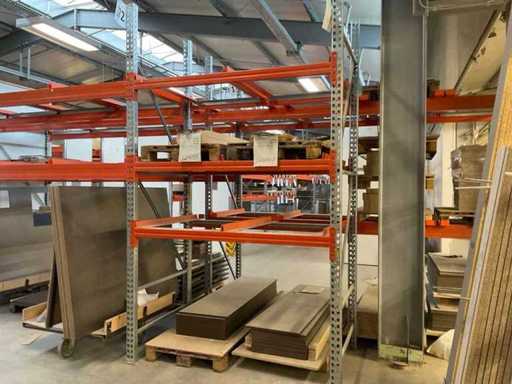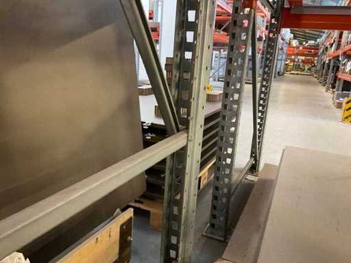 Heavy-duty shelf consisting of: 3 stands approx. 1100x3300mm, 6 trusses approx. 1790mm, 4 trusses approx. 3600mm, incl. pallet holders, with contents