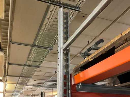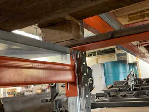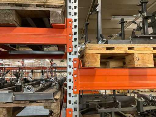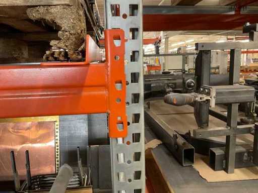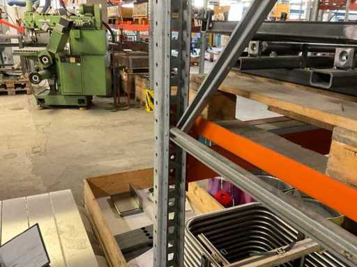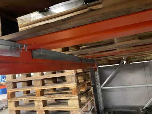 Heavy-duty shelf consisting of: 2 stands approx. 1100x3300mm, 1 stand approx. 1100x2900mm, 8 trusses approx. 3600mm, incl. pallet holders, with contents