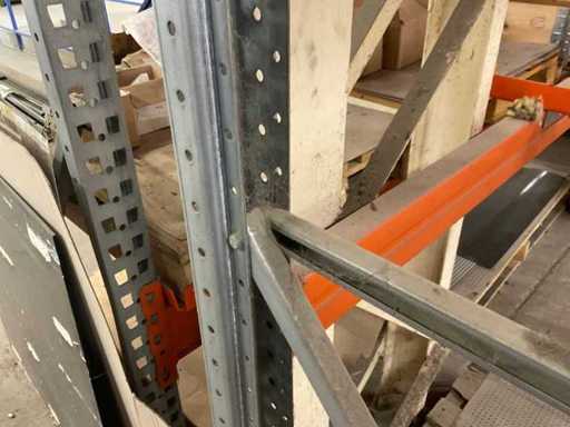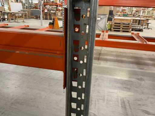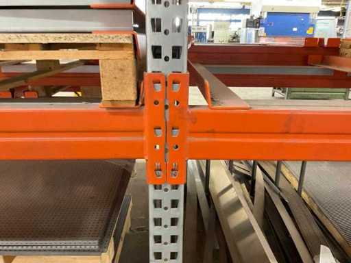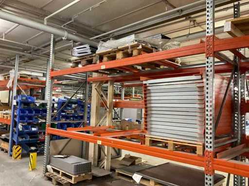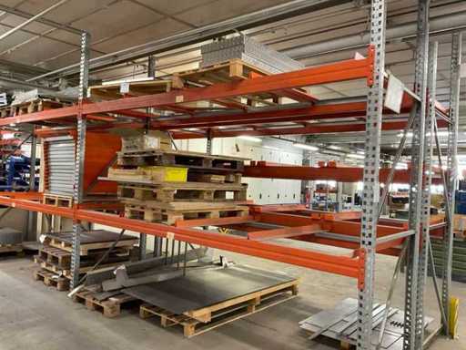 Heavy-duty shelf consisting of: 3 stands approx. 1100x3300mm, 8 trusses approx. 3600mm, incl. pallet holders, with contents