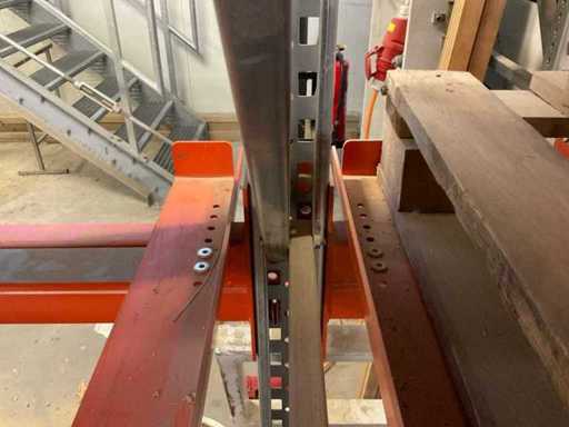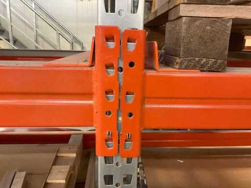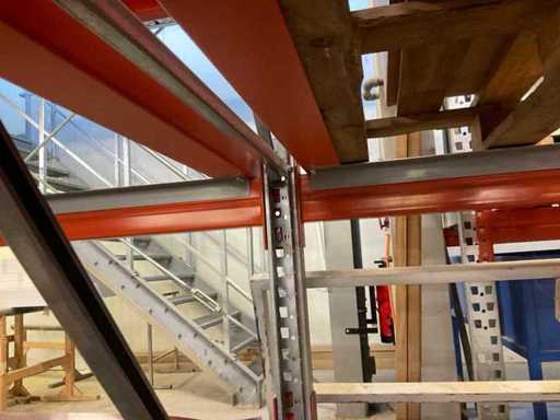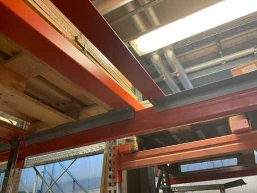 Heavy-duty shelf consisting of: 3 uprights approx. 1100x3300mm, 8 crossbars approx. 2700mm, 6 crossbeams approx. 3600mm, incl. pallet holders, with contents
