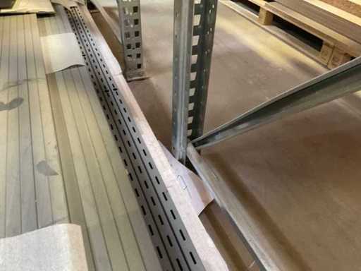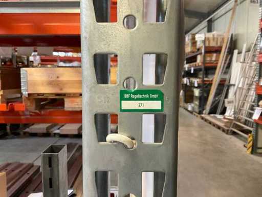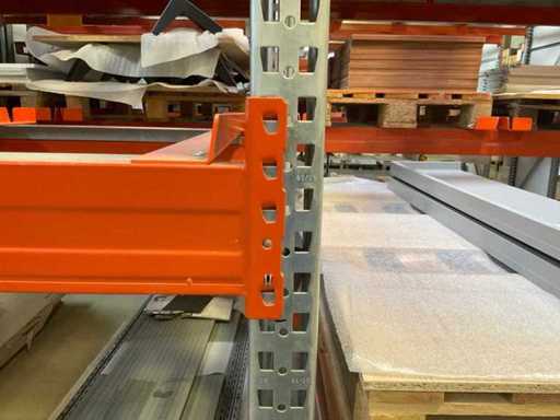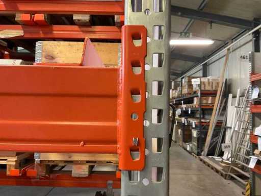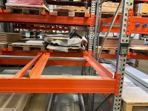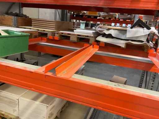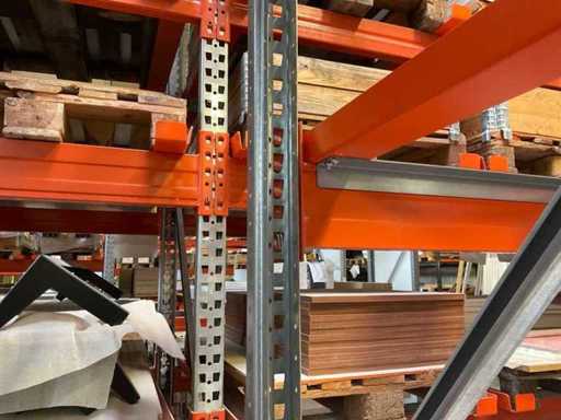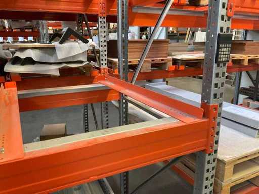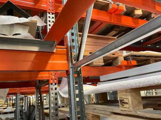 Heavy-duty shelf consisting of: 3 uprights approx. 1100x3300mm, 10 trusses approx. 3600mm, incl. pallet holders, with contents