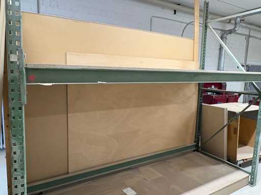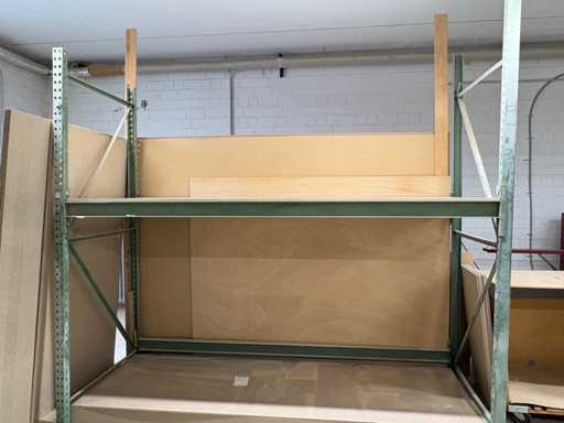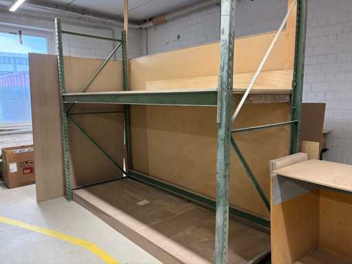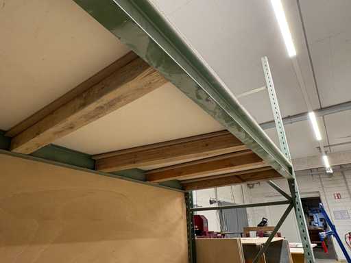 Sturdy workshop shelf with wooden support – approx. 2.7 m wide – 1 shelf – steel frame For
