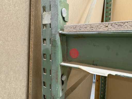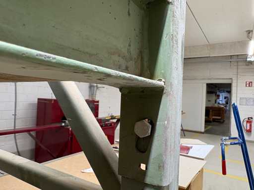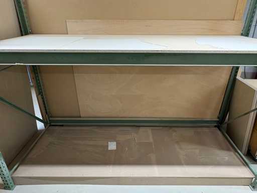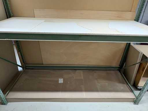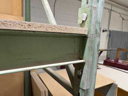sale is a used but stable shelf/work table combination module, consisting of a green lacquered metal frame with a load-bearing MDF/chipboard support.