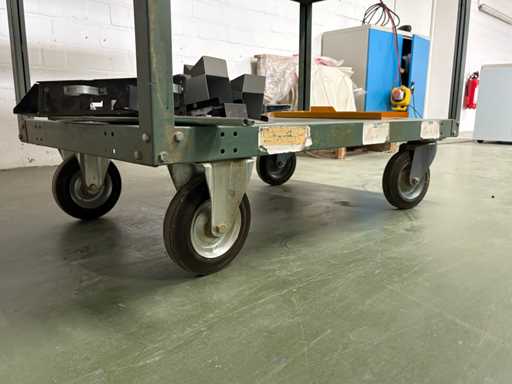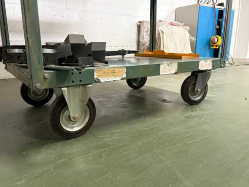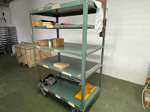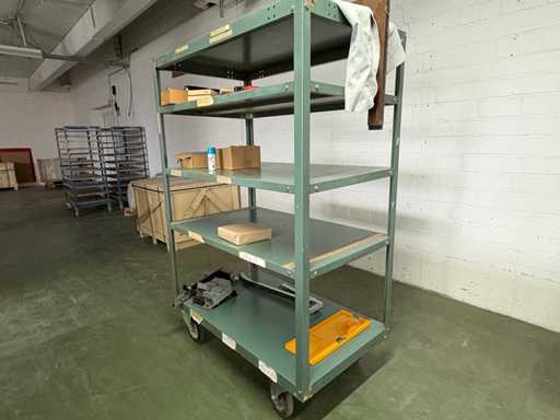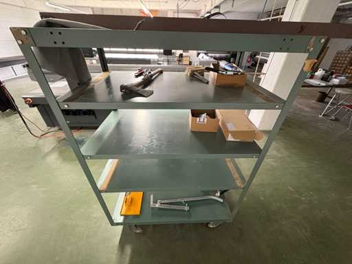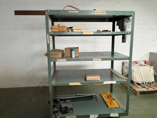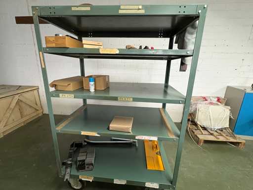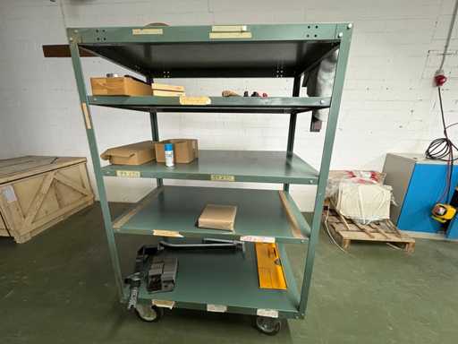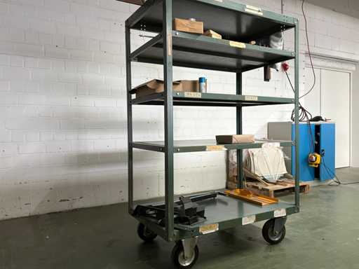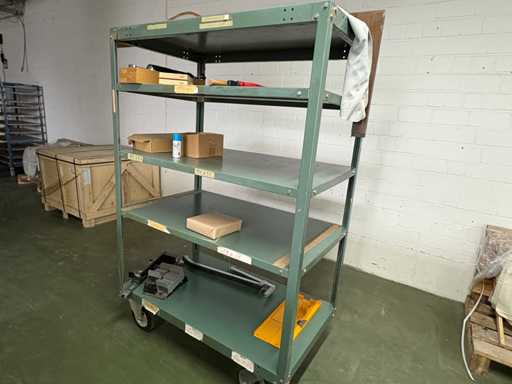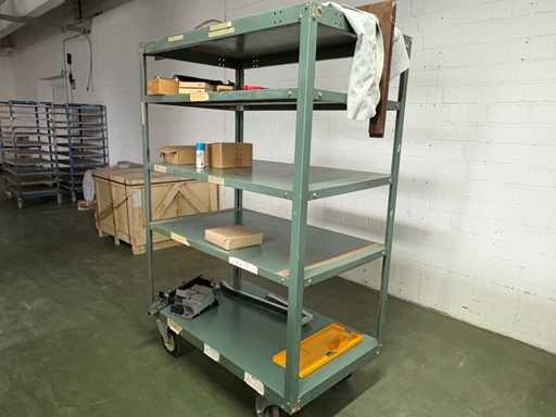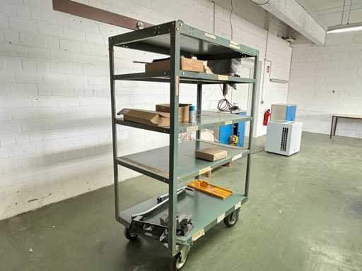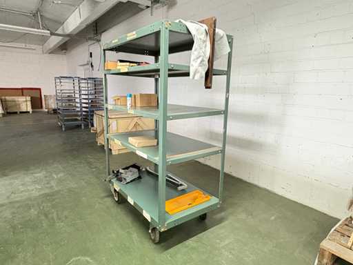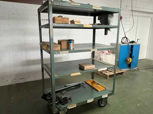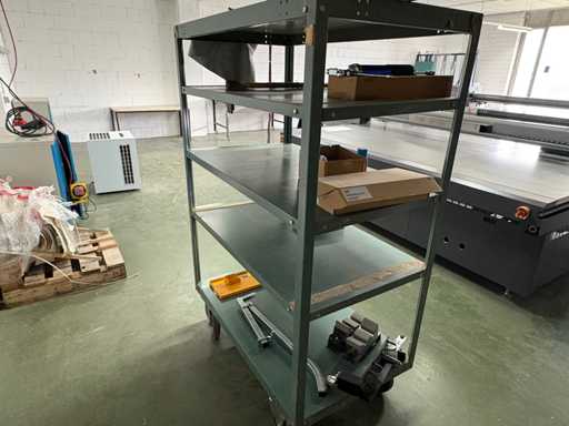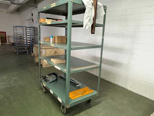 sale is a robust metal tool trolley with five flat shelves and four industrial castors. Ideal for workshop, warehouse or production. The trolley is suitable for tools, machine accessories or material supply.