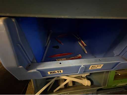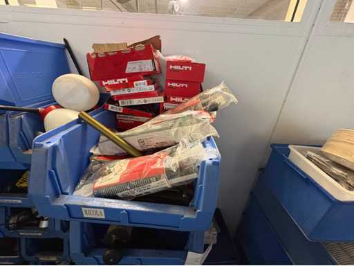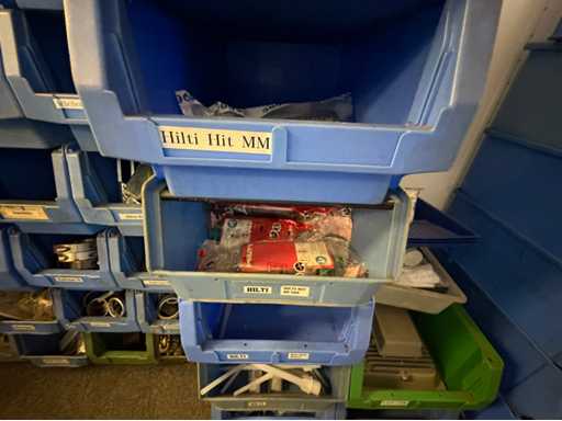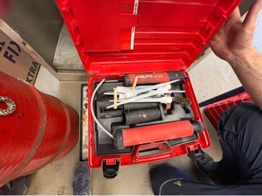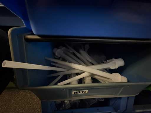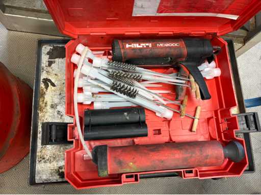 • Hilti injection system range consisting of: • Hilti MD 2000 / MD 2500 injection mortar squeezers (3pcs) • Original Hilti case with accessories (mixing nozzles, cleaning brushes, adapters) • Several Hilti HIT cartridges (types e.g. HIT-MM, HIT-HY 200, HVU2 – partly unopened) • Composite anchor accessories: sieve sleeves, threaded rods, fastening material • Plastic boxes with other Hilti accessories (injection anchors, sleeves, mixing tubes)