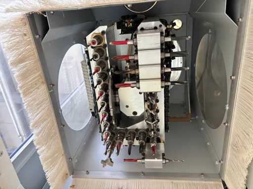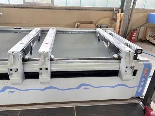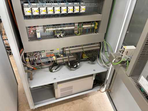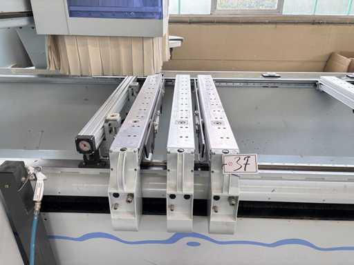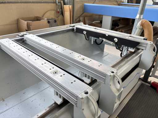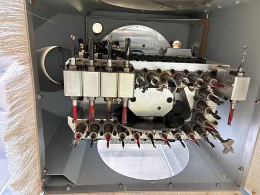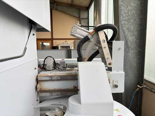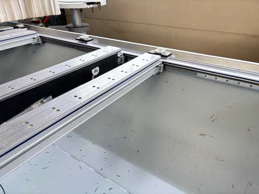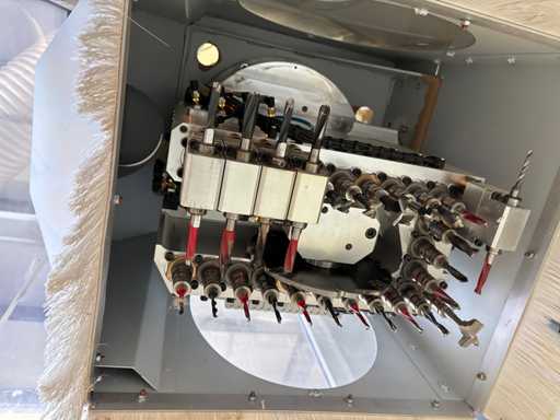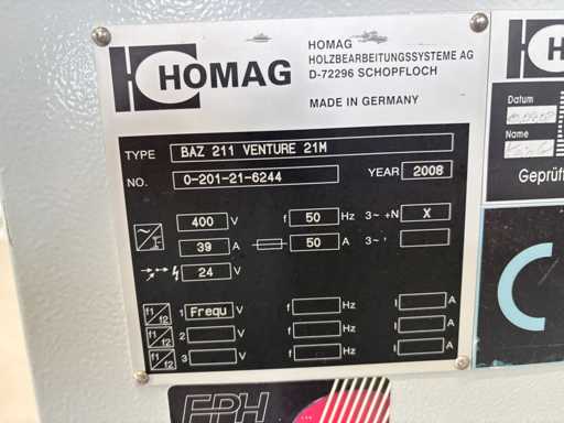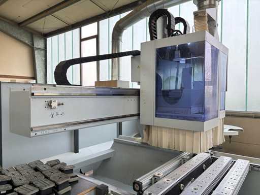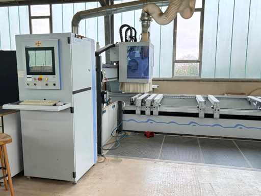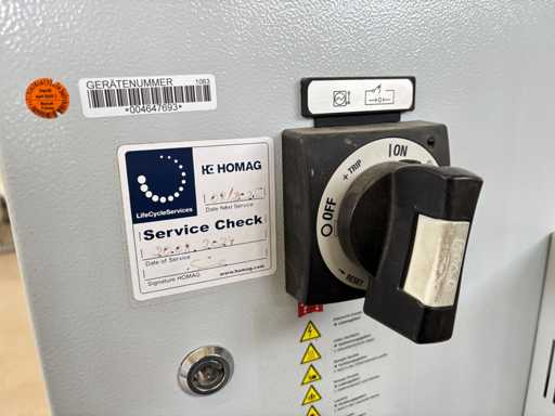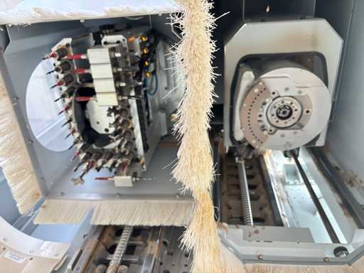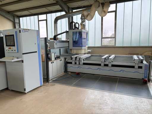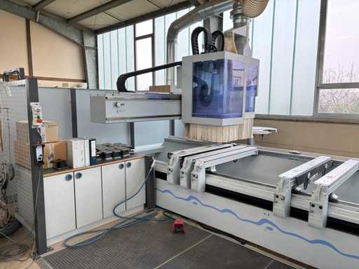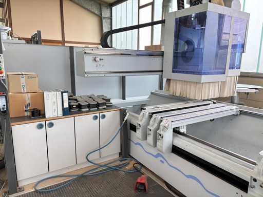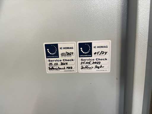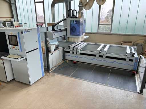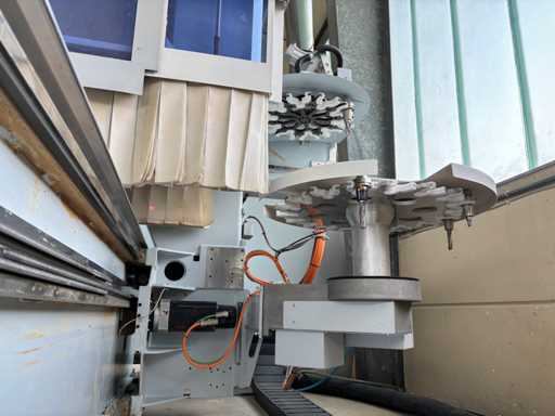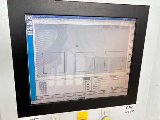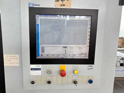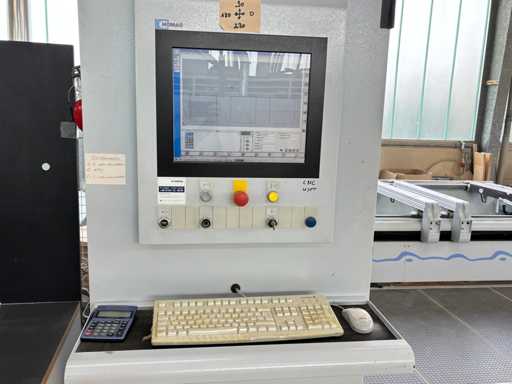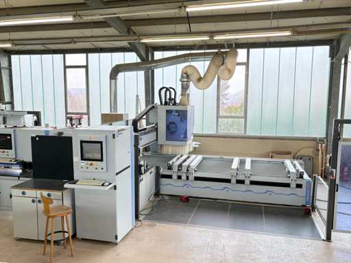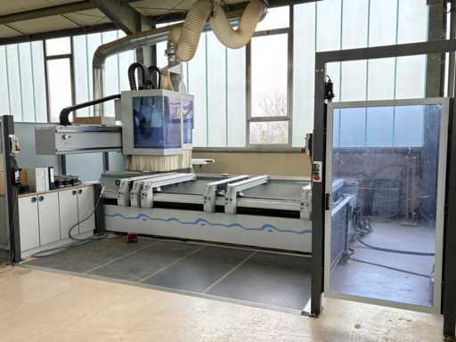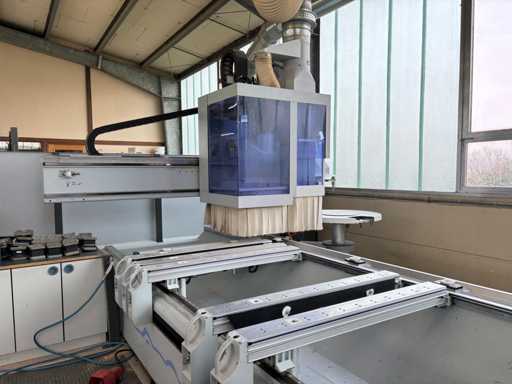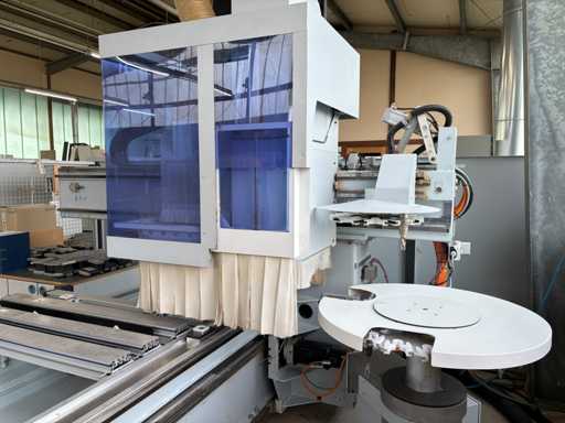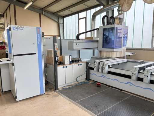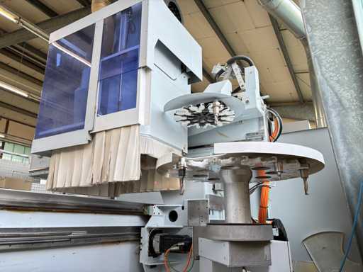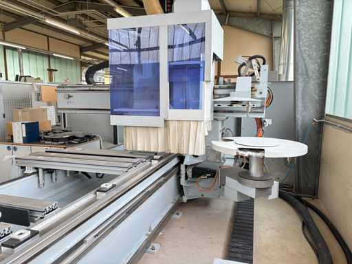 Machine No. 0-201-21-6244, workpiece length with tool diameter max. approx. 3225 mm, workpiece length all units max. approx. 3050 mm, workpiece width rear stop with tool diameter max. approx. 1550 mm, workpiece width rear stop all units max. approx. 1400 mm, main spindle approx. 18 KW with C-axis and interface for Flex-5, main spindle speed 0 - 24000 rpm., disc changer 10 & 18 speed, MPU 360° drill head V20/H10/saw/S360° with approx. 30 spindles and motor 2.7 KW frequency-controlled, Travel speed X-Y axis approx. 80 m/min. and Z-axis approx. 30 m/min., console table K LED position display system, brackets 6 pieces with length approx. 1340 mm, vacuum pump, Power Control PC85 control with WoodWOP 5.0 (The article is in condition as existing and unchecked. The dismantling and loading costs are binding! The item is sold without content / material!) Other tools and units for the tool changer are not included. For the transport of the dismantled machine, a transport frame is required from HOMAG, for which costs of EUR 6,500,-- plus VAT are charged. After the transport rack has been returned to Helmut Meier (Germany Burgthann), the amount will be refunded minus a 20% discount in value.)