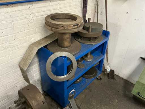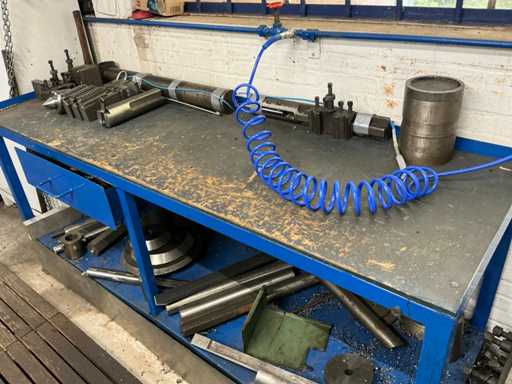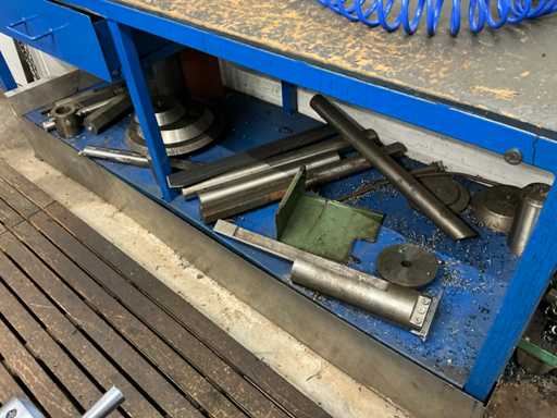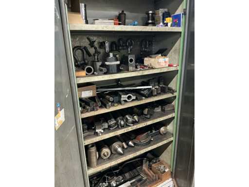 Provided digital readout and various accessories, including chucks, chisels, tool holder, center points, etc, in and on workbench and cabinet