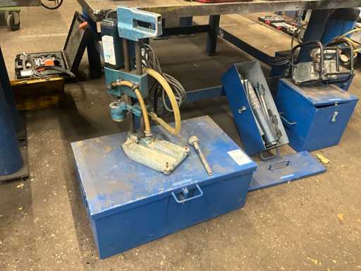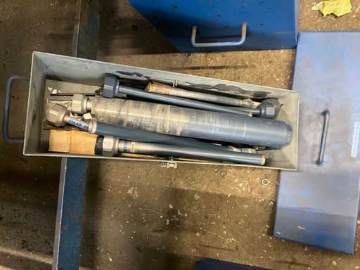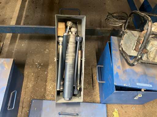 Consisting of: tripod with drill, box with various sizes of drills, water pump, in and including 3 metal storage boxes.