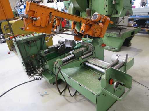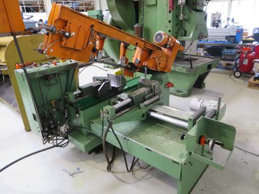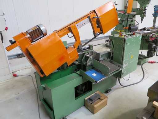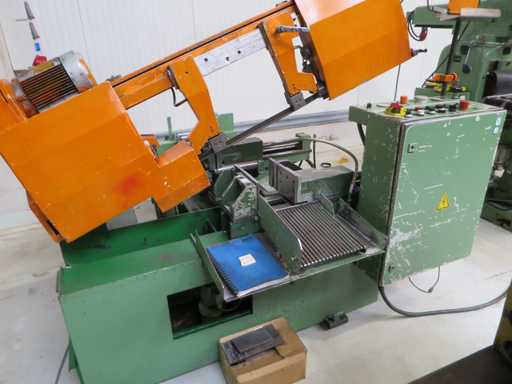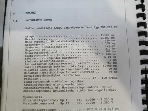 High-performance fully automatic band saw machine with - Coolant system - Documentation Cutting diameter 260 mm Cutting width 400 mm Cutting area at 90 degrees: flat 400 x 260 mm Cutting area at 90 degrees: square 260 x 260 mm Cutting range at 45 degrees: around 260 mm Belt speed 17 - 110 m/min Motor power 3.5 kW Saw blade dimensions 3830 x 25 x 0.9 mm Machine weight approx. 1.3 t Space requirement approx. 2.1 x 2.0 x 1.6 m